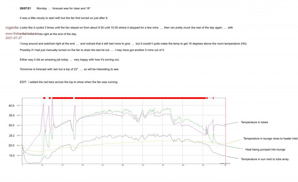 Just thought I'd throw up todays results and come back later to answer some of the above comments. Gotta go out and practise my ally welding otherwise this new one will never get finished. We started at about 17 degrees in the lounge this morning and got up over 22 in the arvo. When I came in at 7pm, the house was still nice and warm and I was almost tempted not to light the wood fire ... but that would be a mistake because it would freezing by morning. I edited the image to show when the fan was running. ![]() Edited 2021-07-27 02:03 by rogerdw Cheers, Roger |