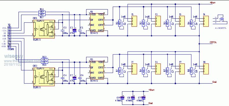 I follow a similar philosophy to Warp when it comes to high power stages and isolate as much as possible from the control board. Although it is unproven at this stage I decided to share my inverter approach to minimise noise from the output stages reaching the control board. My power output stage PCB's (2 required for a full bridge) will have 1 leg of the bridge per PCB Each Leg of the bridge will have 4 x FETs in parallel. The upper FET drive stages each have an isolated 12V supply to power the gate driver ICs which are fed by opto-coupled inputs. Another isolated supply drives both the lower FET driver stages on each PCB as they will share a common Source Battery negative connection, and also have opto-coupled inputs. The opto-couplers for each of the 4 sections of the bridge could be driven by 2 x IR2184's which have internal dead-time on the control PCB. Employing simpler drivers & using cross coupled optos as per Warps favored driving method for each bridge leg will provide both dead-time and high noise immunity. As the 4 x bridge stages all have opto-coupled inputs and their power supplies are each isolated there is no direct electrical connection between the FET bridge PCBs and the control PCB - they are in effect galvanically isolated. The control PCB has the small auxiliary power supply that provides the 3 x 12V isolated supplies. It also contains the nano and other support circuitry as per TinyTs circuit. The only connection from the control board to the Power stage will be a ground connection to reference the battery voltage reading - and of course a high impedance resistor for the +Ve Battery voltage measurement. The result should be a very quiet control board environment with minimal noise pickup. If the output bridge was to go totally feral with fireworks etc nothing can pass through the optos or the isolated supplies to damage the control board. The 2 x output PCBs can be easily swapped out or repaired depending on the damage sustained.. For anyone interested here is the circuit - but use at your own risk, this is not intended as a proven project design - yet. I am waiting until Poidas software and the control PCB circuitry is a bit closer before sending them all out for manufacture. ![]() 2018-11-22_005206_Output_PCB_Sch.pdf Schematic picture is a bit ordinary so PDF uploaded here If at first you dont succeed, I suggest you avoid sky diving.... Cheers Mike |