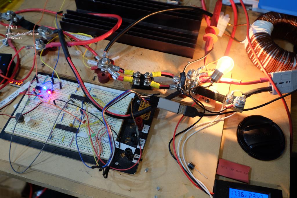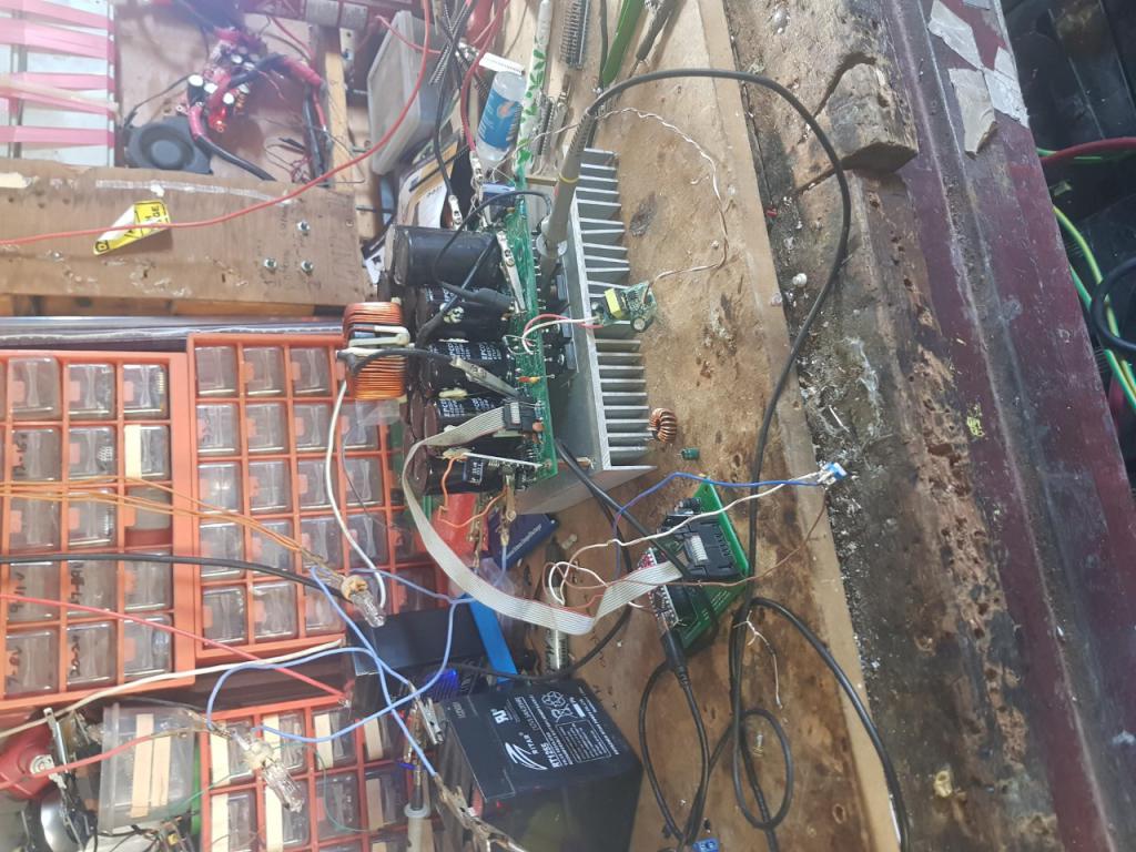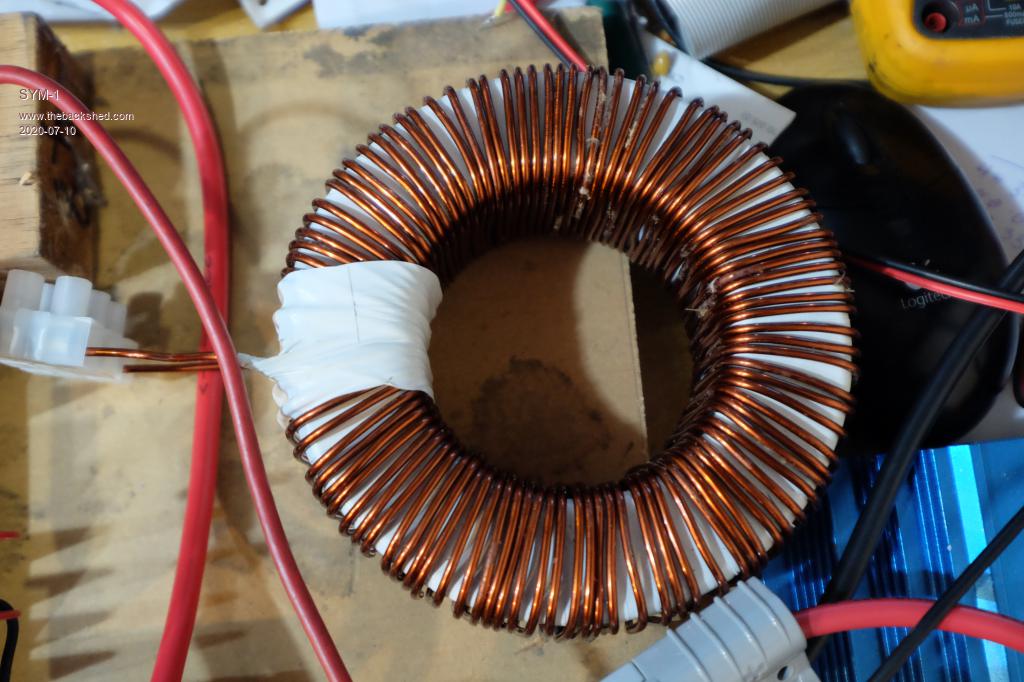 I haven't populated the boards yet and I only have 100 turns of 2.3mm dia on the -2 inductor. I am intending to increase this to 4 sets of parallel sets of 100 turns yet to get the resistance down. Losses are still quite high. Some of this is due to my slow gate switches using 2 sets of PC817 in a DCOI arrangement. I used 2 sets because if you one set you get inversion and the micromite I am using to produce the PWM signal defaults to ON if the program stops so I get full voltage across the output. I have been through a few fuses and $3 FET's. I am using a IRFB4115 FET for testing. The diode I am now using is a VS-UFB280FA20 from RS. It is 45ns and 1.1V drop at 120A. Two diodes in the package. So losses probably high due to 3 things -DCOI -losses in windings The DCOI is quite slow on the rise time but the upshot of this is I have no switching noise. I plan to try out the FET's everyone else is using plus one or two other FET's I have once I am happy the circuit is stable. I blew up my first pair of diodes - they were 10A diodes (2 of them) but they blew up at about 11A. The diode I am using now is rated at 175A and 200V. Here are some pictures of progress so far. Voltage In Voltage in drops a bit because I have a 1 Ohm resistor to stop inrush at the moment. Here is a picture of the input pulling 1kw from my batteries. Here is the output Here is the trace of the output voltage across 0.75 Ohms. I am getting about 5V swing - 6.6A I am running at about 8kHz. At 20kHz I don't get as much transmitted energy. Maybe when I speed up my gate drive I will be able to increase the frequency. I get a bit better efficiency at higher frequencies. Here is a picture of the test bench. The FET is on the big heatsink. It does not get off cold. The lamp is a 24V lamp which is my highest target voltage at this stage and gives me a good idea how the circuit is running. The micromite monitor The load The DCOI driver using PC817's The 5.2 inch -2 inductor with 2.3mm dia windings Here is the gate power supply. I think there is some advantage to limiting this 16.9V to 12V to speed up the gate. I will try that in the future. Persistence is the key |