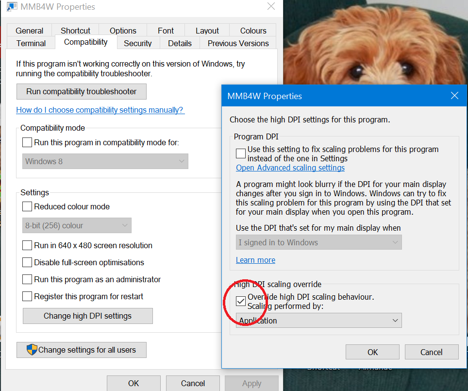 Do your laptops run high DPI. If so, that is the problem (or it is with my laptop) I created a desktop shortcut and then edited it's properties ![]() Previous versions of MMB4W were OK Edit with more information: My laptop is running Windows 10. On my laptop the MMB4W opening screen is too big for the display. With earlier beta's the sign-on text is off screen and just a hint of it is visible. Turning off DPI settings makes life better. The latest beta gets as far as opening the main window and stops. I can't tell if any of the sign-on text is there. There is no response to the keyboard. Turning off high DPI works nicely for the latest beta and I prefer it that way. Jim Edited 2023-05-31 14:11 by TassyJim VK7JH MMedit |