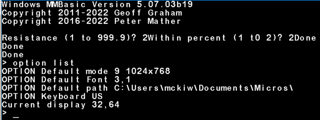 Do these settings actually work in the latest version of MMB4W? I can't test it because the latest version just gives me a black screen and no cursor, even if I <enter> many times; cls rgb(red) doesn't change anything, but QUIT works. In version 5.070316, which works for me, OPTION MAXCONTROLS 20 responds "Invalid Option", and "GUI CURSOR" responds "Syntax". PicoMite, Armmite F4, SensorKits, MMBasic Hardware, Games, etc. on FOTS |