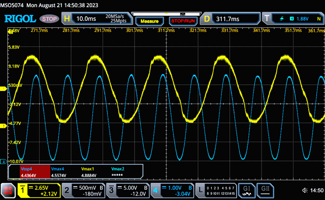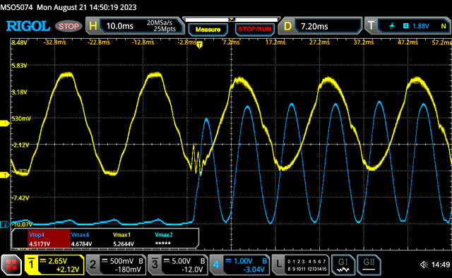 So for anyone interested, I have some screen saves from the DSO and a comparison of one of the loads when the Toriod was resonating at 119Hz. Even small loads were causing various levels of flat topping on the DC current sense output.