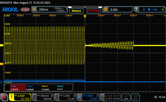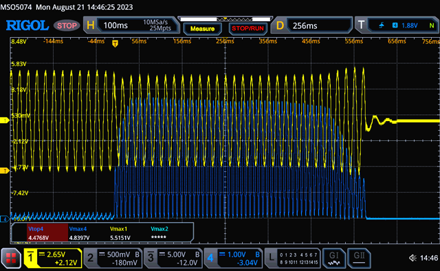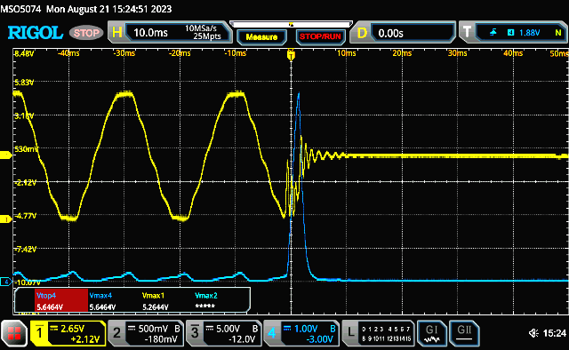 There is a second period of ringing around 40ms after the PWM was inhibited, this would be the ATS (auto transfer switch) removing the Toriod secondary from the various running Loads and transferring the AC line Loads back to Mains AC. This causes no issues with the Loads and all workshop machines have NVR switches (No Voltage Release) so they must be restarted manually if power is interrupted in any way.