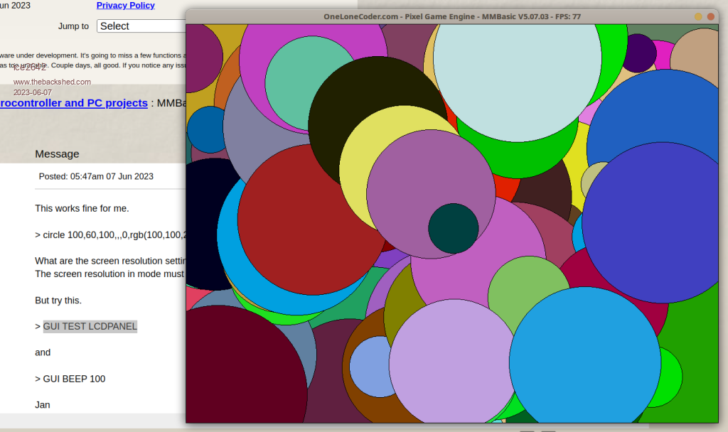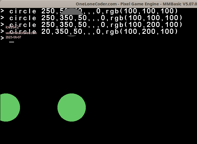 This works fine for me. > circle 100,60,100,,,0,rgb(100,100,200) What are the screen resolution settings in windows and what is in the option list? The screen resolution in mode must be smaller than in the windows settings. But try this. > GUI TEST LCDPANEL and > GUI BEEP 100 Jan |