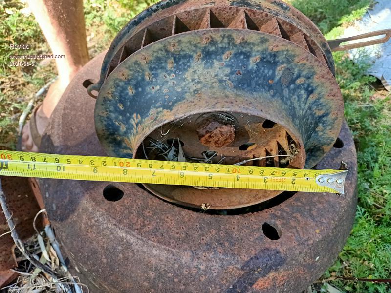 That all looks perfectly reasonable Roger. The flow with one inch back pressure is about 650 CFM, and its reasonably quiet as it runs at only 1750 rpm, and it would be very easy to control the speed. Now its 12" diameter (300mm) and generates 2 inches at zero (blocked flow) and runs at 1750 rpm. To get similar performance at 2800 rpm at the same tip speed would require a rotor diameter of 1750/2800 x 12 inches, about 7.5 inches diameter. That comes pretty close to my original guess of an eight inch rotor being the practical minimum. I suppose it comes down to how much the beast costs....... And you will have to fabricate a housing for it which will be very easy. Another way to do it would be the cooling rotor from an old air cooled VW engine fitted to a 2800 rpm induction motor. I just found some info on that here: http://offroadvw.net/tech/wes/fan.html It says the inlet diameter is 150mm so going by the picture the outside diameter must be at least eight or nine inches, so the developed pressure should be fine. According to the graph of measured airflow, at 2800 rpm flow should be around 500 CFM+ with the wider rotor. This still involves building a housing, but the motor and rotor should cost just about nothing. Cheers, Tony. |