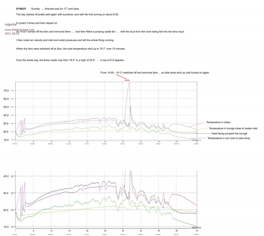 Very nice Roger, the tubes are now running at less than ten degrees hotter than the house and you have pretty much reached the point of diminishing returns of heat recovery. With more tubes and less flow restriction, that blower should do very well, even with extra added ducting length. A six degree rise is excellent, and pretty amazing. As the days get longer, things can only further improve. Edited 2021-08-02 08:27 by Warpspeed Cheers, Tony. |