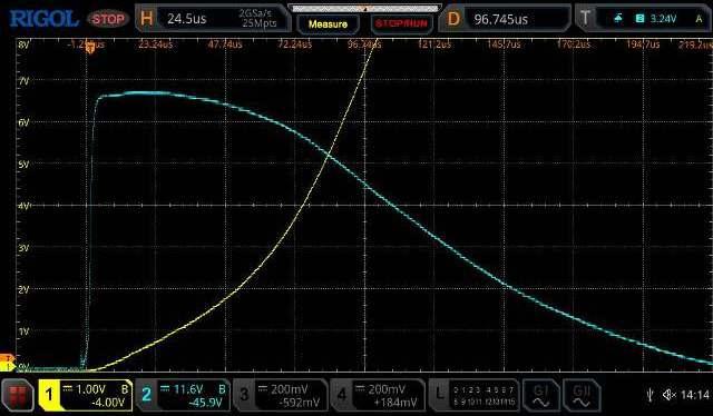 If the Choke is replaced with the same winding lenght cable, the Cap voltage trace is simply a narrow pulse from 50V to 0V ("almost" zero inductance).