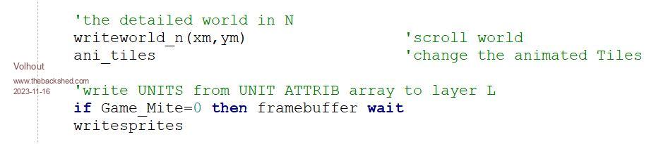 In the game loop there are functions and subs that work on background data, and subs that actually write to the screen. Sometimes the name of the subs can be confusing (due to my personal development in writing games, I sometimes changed the content (and thus function) of a sub. And it not always exactly does what it's name says (i.e. writeplayer does not actually write to ecreen anymore).