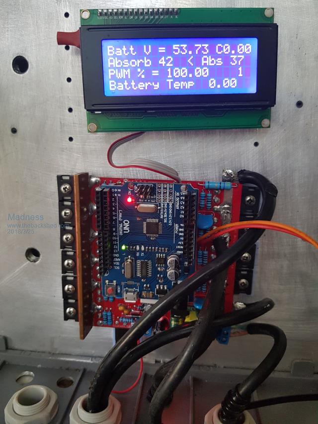 Here is a photo of the GTI regulator in operation, I did not have a battery temperature sensor connected at the time this was taken. It has temperature compensation included, regulation could be easily changed for various types of batteries. 3 X 15mm Copper bar on the left is connected panels DC to DC with PWM regulation. Right side is the high voltage DC regulation going to the GTI.