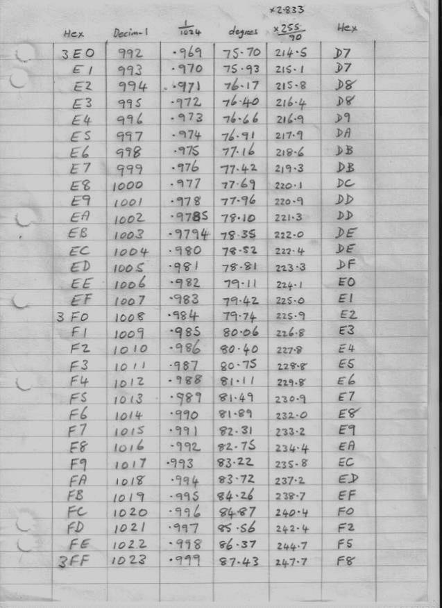 Warpspeed: v asin(v) 1000 3E8 0.98 1.35 DC 1001 3E9 0.98 1.36 DD 1002 3EA 0.98 1.36 DE 1003 3EB 0.98 1.37 DE 1004 3EC 0.98 1.37 DF 1005 3ED 0.98 1.38 E0 1006 3EE 0.98 1.38 E1 1007 3EF 0.98 1.39 E2 1008 3F0 0.98 1.39 E3 1009 3F1 0.99 1.40 E4 1010 3F2 0.99 1.41 E5 1011 3F3 0.99 1.41 E6 1012 3F4 0.99 1.42 E7 1013 3F5 0.99 1.42 E8 1014 3F6 0.99 1.43 E9 1015 3F7 0.99 1.44 EA 1016 3F8 0.99 1.45 EB 1017 3F9 0.99 1.45 EC 1018 3FA 0.99 1.46 EE 1019 3FB 1.00 1.47 EF 1020 3FC 1.00 1.48 F1 1021 3FD 1.00 1.49 F3 1022 3FE 1.00 1.51 F5 1023 3FF 1.00 1.53 F8 1024 400 1.00 1.57 100 When using 8 bits to represent the angle, resolution loss appears to me to be a problem once the sin() value gets to 1020 or so. Then the rate of change of the angle becomes more than one for each unit increase in v To get degree or sub degree accuracy of the angle at these large values, you will need more resolution in the input value, not just 0 - 1023 The function asin() has a rate of change that is too fast for single degree resolution using 10 bits of input at these angles. wronger than a phone book full of wrong phone numbers |