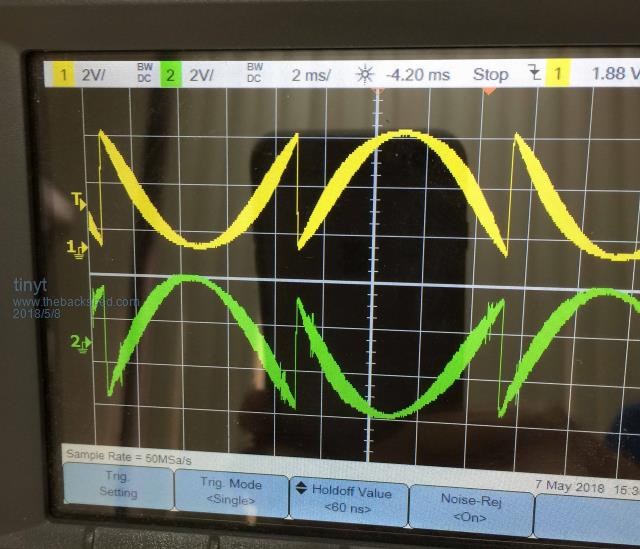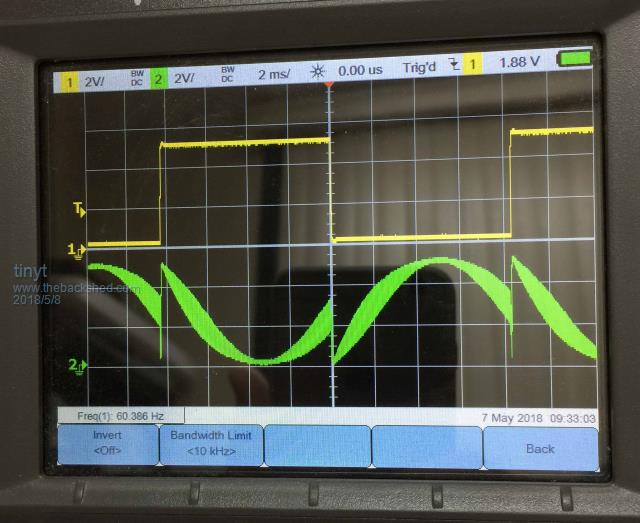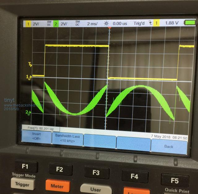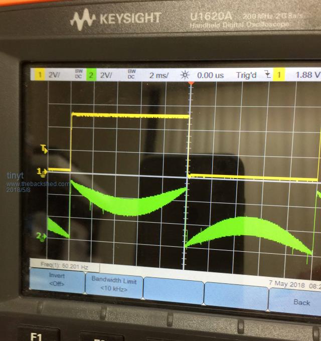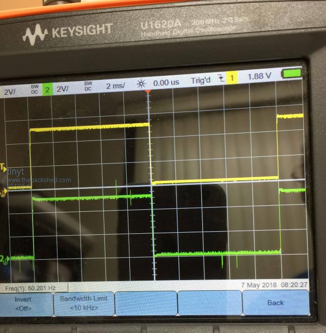 Finally got Poida's code loaded on a NANO using an old STK500. I like the STK500 because it self powers the chip. But it couldn't drive the chip Reset down to zero. Found out that the NANO has a Reset pull-up of 1K compared to the 10K of the UNO's and MEGA's. So I just remove the 1K from the NANO. This one is after power on: ![]() This one is immediately after the start button is pressed, SPWM is ramping up: ![]() This one is when ramping is finished: ![]() When I changed TCNT2=100; to TCNT2=120;, the scope shows Freq(1) = 57 Hz. Changing it to TCNT2=126; made the scope Freq(1) = 60 Hz. The SPWM waveform is a little messed up with this change. ![]() It is not my 'scope by the way, I just borrowed it. Making this change also makes the SPWM good again. #define PPWM (133333 / NPWM) // might need some fine adjustment?. |