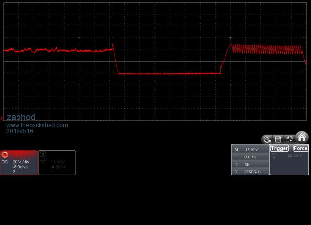 Well due to the dynamics and reaction times there are a few hiccups to fix, here is a typical overvoltage trip (booster locks out for ~7 seconds):
