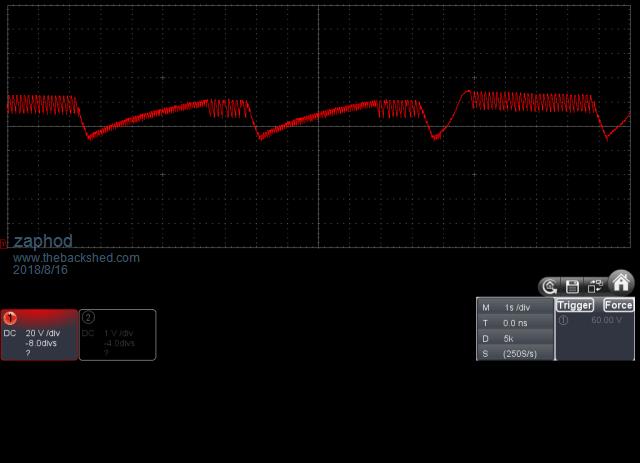 Now in utopia this is not supposed to happen because the H-bridge will only switch off at or near zero cross when the smps is ramping down to zero power BUT as I have explained before I live in a rural area with really nasty stuff on the grid and I already have a lot of trouble tracking zero-cross in software, noise often occours near zero-cross as at that point the noise immunity of its detector is at its worst. To protect the H-bridge from catastrophic software failure there is a hardware path from the zero-cross detector to the H-bridge forcing the H-bridge open near zero cross. Unfortunatly this also provides a path for the H-bridge to open should there be a spike from the zero-cross detector that because spikes are ignored by the software will not cause the smps to shutdown, in other words in real life it is possible for the H-bridge to unload the smps whilst it is still working!