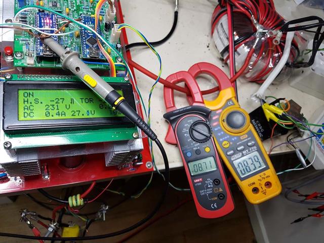 Mike, the duty cycle is a nominal 800 clocks, at 16Mhz. This means a 20kHz PWM cycle. I can, on a 20kHz cycle by cycle basis, alter the duty % as needed. From memory if you use a duty cycle of 1, you get a one clock pulse high with a 799 clock low. If you choose a duty cycle of 799 you get 100% on with zero clock periods off. This is a particular behavior of the ATMega328. In the code block "loop()" it runs once each 1/2 cycle of the 50Hz. i.e. 100Hz at zero crossing time, I determine the correction needed to obtain the required AC output voltage. This voltage is directly proportional to duty cycle %. I determine the required "power" value, and then ensure it does not fall below 0.01 or above 0.99, then multiply it by 800 and that is now the duty cycle in clocks. So, a power factor of 0.01 is equivalent to 0.01 x 800 = 8 clocks. This 8 clocks is the minimum duty cycle ever output to the gate drive ICs. And 0.99 x 800 = 792 which is the maximum duty cycle, in clocks, ever output. So the gate drive ICs will see a square wave, 20kHz, with duty cycle ranging from 8/800 to 792/800 clocks, at 16MHz. That is, 0.5uS ON, 19.5 uS OFF for the floating point power command of 0.01 and 19.5uS ON and 0.5uS OFF for a command of 0.99 I ensure there is some significant amount of ON/OFF, at the 20kHz base frequency to keep the charge pump circuit functioning. With dead time and slow rise and fall times of the total gate drive circuit, this 0.5ms pulse does not amount to much ON time for a MOSFET. Since we all here understand how DC is converted to an AC output, we size the primary windings appropriately to ensure we never need 0.99 power level. I sized my 24V primary to be 12.6V AC (which is of course 17.8 V AC p/p) yielding ample headroom for droop due to resistance. My duty cycle % would be approx. 17.8/27.4 (27.4V is my usual test voltage on the bench) so it's about 0.65, or 520 clocks at the peak of the waveform. How I modulate power output: Already we see I need a power output of 0.65 for 230V AC My soft start operates from a start point of zero power output (of course, brought up to 0.01, to ensure charge pump operation), and each 1/100 second, the following occurs: if AC output is less than set point, add 1/300 to power, convert to duty cycle clocks and move on... If AC output is greater than set point, subtract 1/300 from power, convert to duty cycle.. When soft start period has run, switch to PID closed loop, which derives a new power setting from the previous AC output and set point. This new power setting is again converted to clocks of the 800 clock base PWM cycle, and injected into the PWM timer. The above is talking about obtaining ONE number. This number represents the duty cycle at the peak of a sine wave. Scaling a sine wave is done as a linear operation. So I use the above number (power x 800, where power can range from 0.01 to 0.99) to scale the sine wave at all of the points I use along the wave. I use 200 points for the positive part of the sinewave, and 200 points for the negative part. The nano code produces an approximation of sine wave output by outputting a 20kHz square wave of varying duty cycle, with 200 separate points in the half cycle where I can define the appropriate duty cycle %. The ATMega328 has easily enough processing power to calculate quickly the needed amount of duty cycle %, when given how large the maximum point of the wave must be (the power calculation parts, in loop()..) So, every 20 kHz, the nano code is given - for this half wave only - a scale factor for each of the 200 pwm cycles of this half wave. The nano scales the sine wave's duty% value to the required power output and puts it into the timer registers. At startup, I create a table of sine wave values, scaled to 16 bit integer. This saves a huge amount of time in the 20kHz interrupt code block. The table contains 16 bit integers ranging from near zero to 64K, corresponding to the sine function of a 1/2 wave, ranging from 0.000... to 1.0 and back to 0.000 I obtain the duty cycle % value from the appropriate entry in the sine table, multiply it by the integer scale factor and then divide it by 64K (16 bits..) Very fast and it retains plenty of resolution. I can modulate the output AC by one part in 800. This means at 230V with my 12.6V primary and 27.4V DC supply, the output voltage can only range in 0.44V increments. In practice I find voltage control good enough to prevent lights flickering etc. To get finer control over AC output, make the primary winding a higher voltage. ..within loop() I obtain some value for pwr, a floating point variable. if (pwr > 0.99) pwr = 0.99; // clamp. Do math in floating point to prevent any integer overflow if (pwr < 0.01) pwr = 0.01; // it's slower. We could do clamp after conversion to int but it's your mosfets... vpwr = (int)((float)PPWM * pwr);// finally apply required PWM duty power factor to vpwr here I determine, at the present point in time of the 200 points of a 1/2 wave the required duty % lpcount is used to define the point in time of the 0-199 values of the lookup table of the 1/2 wave. The code generated from below does not do any shifts, it just copies the top 16 bits of the 32 bit result to the low 16 bits. 2 clocks for a 16 bit divide. c = (l[pcount] * vpwr) >> 16; // scale sine wave by vpwr, 32 bit integer calcs. 16 bit shift fastest of all depending if it's one or the other 1/2 wave to be driven we apply this duty cycle, in processor clocks, where the PWM clock frequency is 800 clocks OCR1B is the duty cycle register for pin 10 OCR1A is the same for pin 9 (or arse about, I can't be bothered to look at the cpu manual) v1low is the flag to determine if we are driving one or the other of the 1/2 wave parts. if (v1low == 1) // alternate between 2 output compare pins. Get a full 50Hz waveform OCR1B = c; // 1/2 out this pin else OCR1A = c; // and then 1/2 out this pin. Other code in "ISR(TIMER1_OVF_vect)" is mainly related to the mains sync with the needed bit