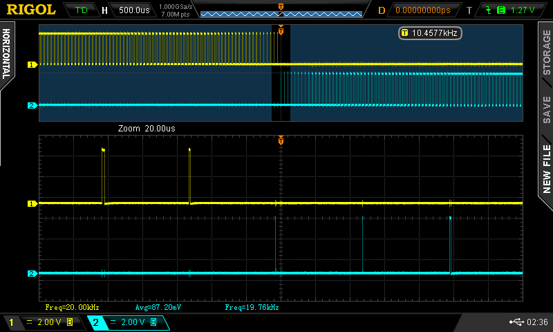 Mike, I've played with the code a little, it removes the initial too wide pulse at the start of each 1/2 wave. I'm at work and only have the 2 channel DSO, so we can not see the v1low trace but imagine the transition from low->high is at the centre of the screen. ![]() Is this what you are looking for? It's likely some sort of "out by one" type of error, but with minor consequences that alter the shape of the output waveform a little. this is the code that produces the above: nano_1_v7_no_bessel_mike.zip that final pulse of the Yellow trace is about 1.0uS wide. Dead time function will place approx 0.5uS dead time on both sides of (this pulse width - 2x dead time) which will be about zero effective pulse width. This is when using the IR2184 which inserts a constant 0.4-0.5 uS DT Edited 2019-10-02 08:53 by poida wronger than a phone book full of wrong phone numbers |