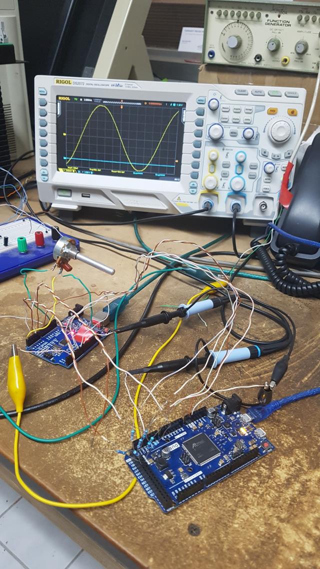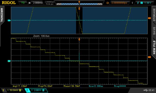 The DAC of the DUE seems a bit noisy, and my DSO was syncing to small ~100khz transitions rather than the big picture so I made D27 go high whenever the input, 8 lines were all zero. The DSO liked to sync on that.