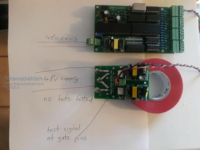 Should all look like this. The wires all fan out logically. ![]() I don't have pictures of the individual gate drive waveforms here to show you, but you should definitely be able to see the drive to each mosfet gate with respect to its corresponding source. Only try to do that without any mosfets fitted !! If you ground the source of the upper mosfet with a mosfet fitted, it will go bang. Cheers, Tony. |