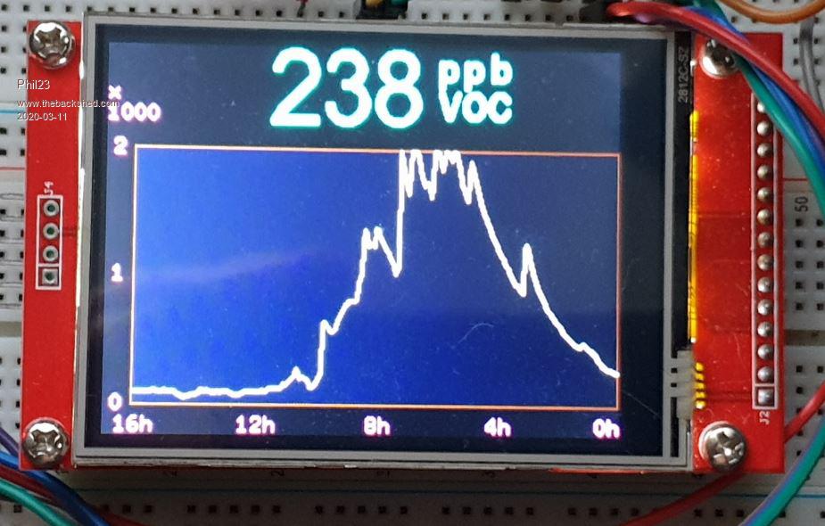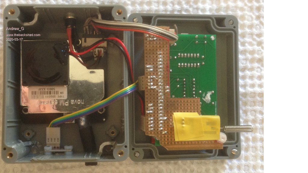 Hi Phil, Thanks for tidying up my "code" - I guess that is what the "Code" button is for?? (Jim's MMEdit formats things to look better so the typos are less apparent.) Here are two pictures: The display shows current P2.5 and P10 values, in larger font, and the minimum and maximum values to date (Cyan and Red). The grey word "Sleep" changes to a green "Awake" when the sensor is working. The top left time is from my HC-12 network as described above. There is no graph (yet) but I graph all my HC-12 inputs on my PC. The other pic shows you can just fit both sensors, an HC-12 and a LCD BackPack in the box. There is a bend in the tube feeding the SDS011 (and its covered in black heat shrink) to reduce the light getting to the sensor. I've enlarged the 4 holes at the back of the box to exhaust air from the SDS fan. I have yet to isolate the VOC sensor from the air inside the box. OK? Andrew |