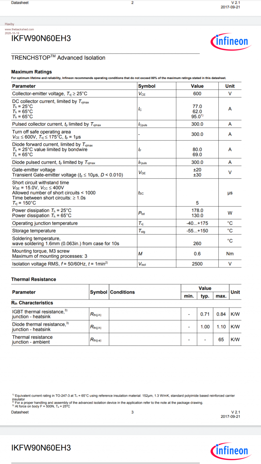 To Make sense of the 65 degree Infineon temperature rating you need to read the additional notes on their isolated TO247 package (pg 12 for summary or 8-11 for verbose info), happy reading....... Infineon-TO-247-3_Advanced_Isolation-ApplicationNotes-v01_01-EN.pdf Edited 2020-11-20 07:32 by wiseguy If at first you dont succeed, I suggest you avoid sky diving.... Cheers Mike |