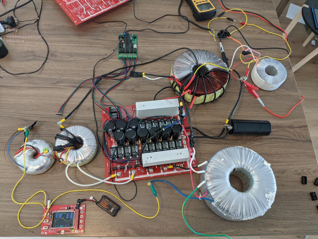 Good news: the high voltage warpverter is nearing completion. Here is a pic of it running on 3 inverters. A big thankyou to warpspeed for all the input to get it to this stage. It has been a great covid lockdown project. I blew up some IGBTs doing something silly so the 4th inverter will have to wait for another day. There are some unidentified spikes on the oscilloscope. Not sure if I trust the oscilloscope though. It's a cheap $40 oscilloscope connected through a 200k voltage divider. For those not following the thread, the toroids are all unmodified, save for a few extra windings to get the volts right. The two biggest toroids are a 3kw aerosharp and a 1.5kw aerosharp. I'm hoping to use this on my 200v DC Prius battery, but it should work unmodified up to 400v. Load testing to follow. And in case you are wondering, that 5th toroid is the isolated mains input power supply. I wasn't game enough to try it right off rectified mains for the first tests. |