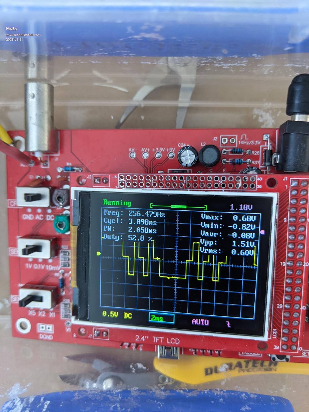 I have one of those "Barby Doll" small oscilloscope boards, and it did exactly the same thing. Random spikes that blink on and off. I would not worry about it, they are almost certainly not really there. I fixed mine with a simple low pass R/C filter ahead of the oscilloscope. Looking at the mains waveform with a real oscilloscope, it looks clean. You will find the smallest inverter makes a big difference. Well done !! Excellent progress. Cheers, Tony. |
