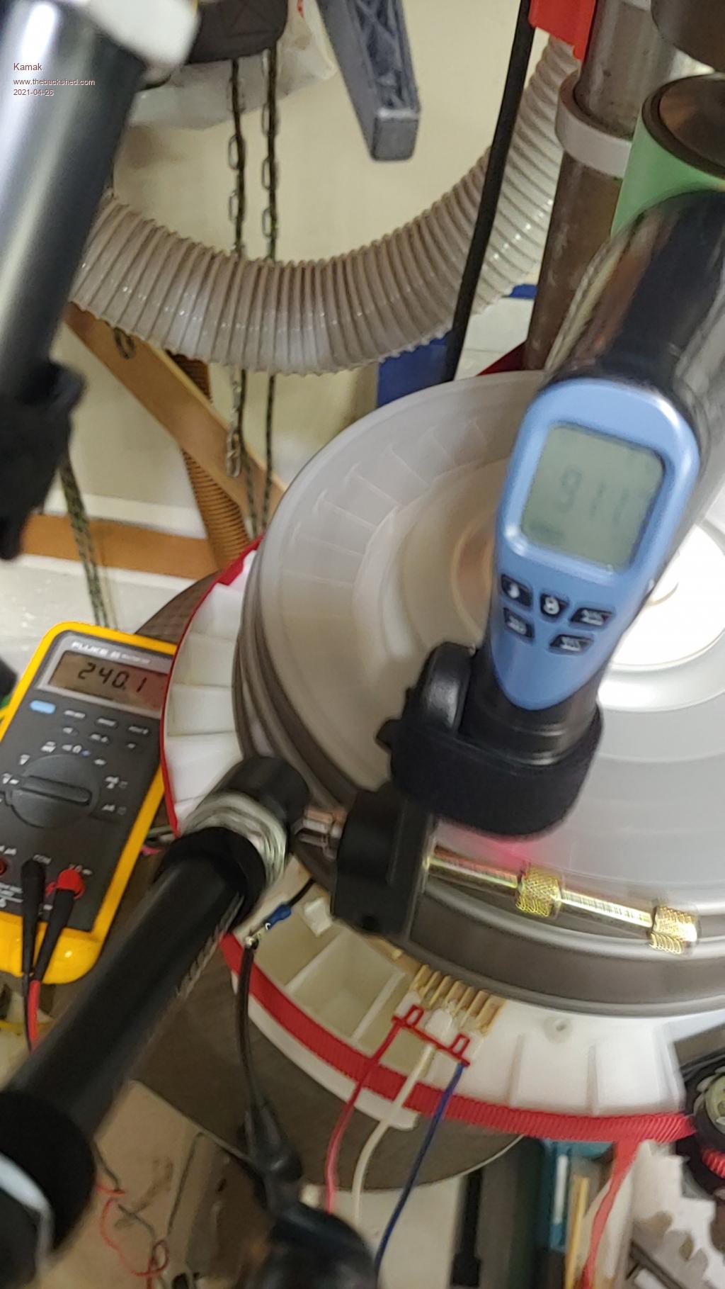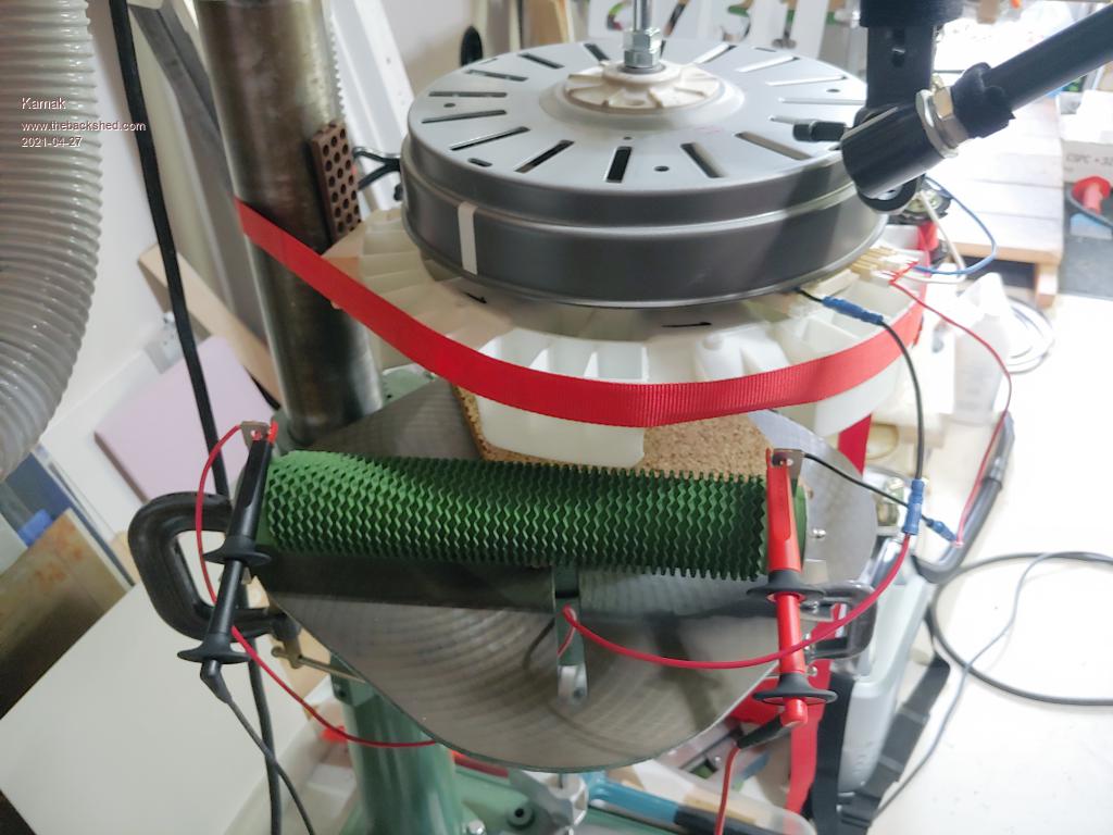 At the moment, I'm only getting 7.7V max. at 2.7A max. ac (20.79W) maximum through a 2.7 ohm 750W resistor across one winding and neutral at 1000RPM. There must be such a minimal ability for the generator, with its combination of existing stock magnets with low magnetic flux density and the number of wire wraps per stock star leg, that it can not produce many amps through such a low resistive load. The three winding each have 6.2 ohms of internal resistance. The light bulb I used, the other day, was 10ohms - cold. it was only a 100W capable device and I was able to put approx 120V at approx 0.919A through it at 500RPM. 120x0.919 = 110.28W. 120/0.919 = 130ohms - hot. I need a higher resistive load capable of higher wattage with a minimum of 2.7A capability, but I can't exceed the RPM of 1000.