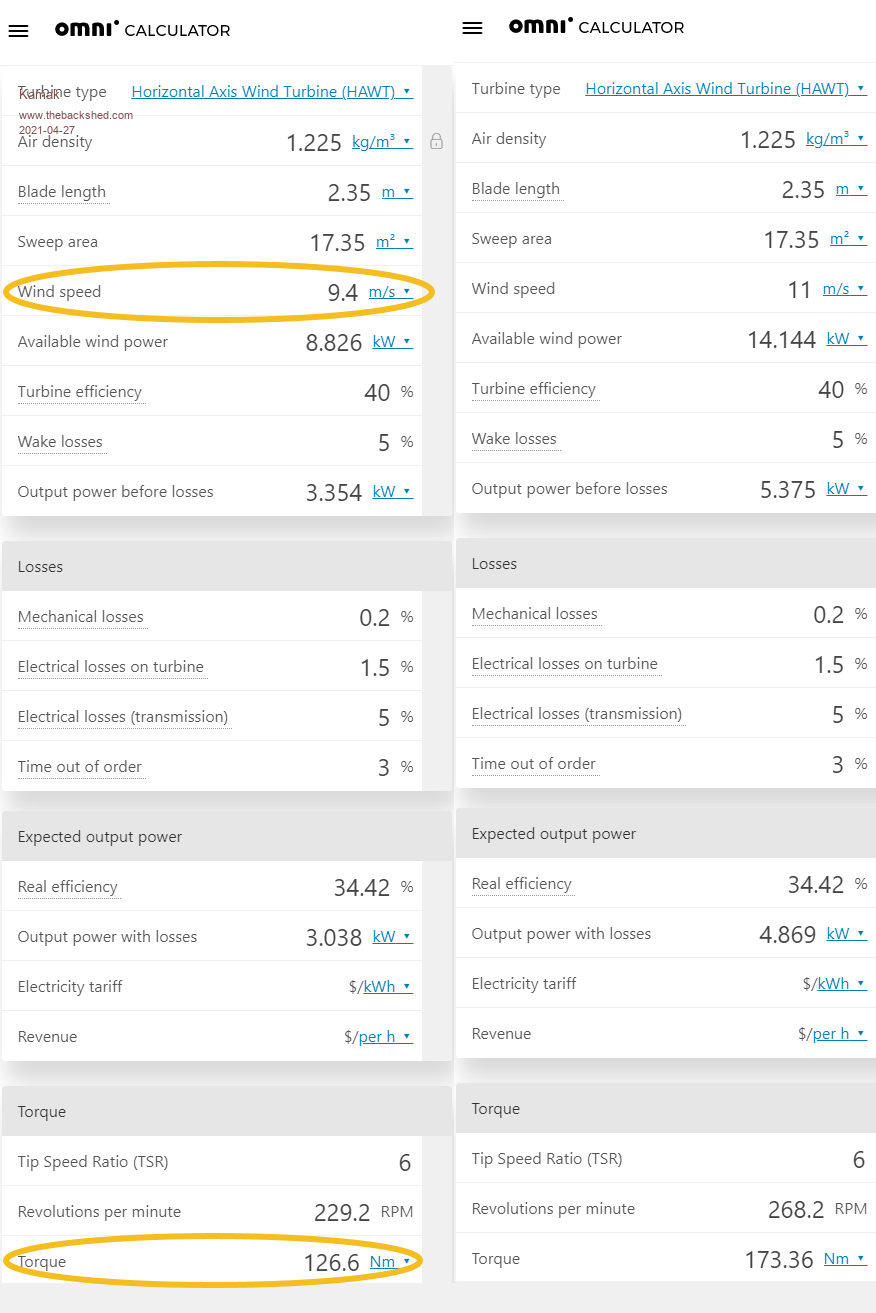Sorry I was playing around with that for a while. That was giving me some head-scratching. There is a massive drop in power produced at 6kph wind as opposed to 20kph winds. So much so, I'm still hesitant that I calculated it correctly. But I think it is correct. It's those cubings, get you every time.