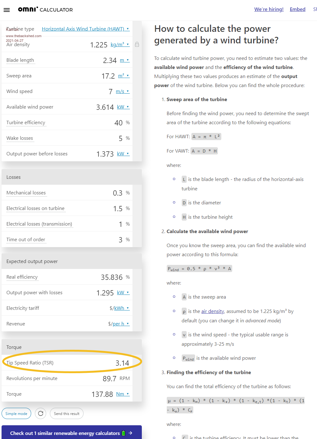 I had to recalculate for a 4 blade rotor. 4 x pi/4 = 3.14 TSR