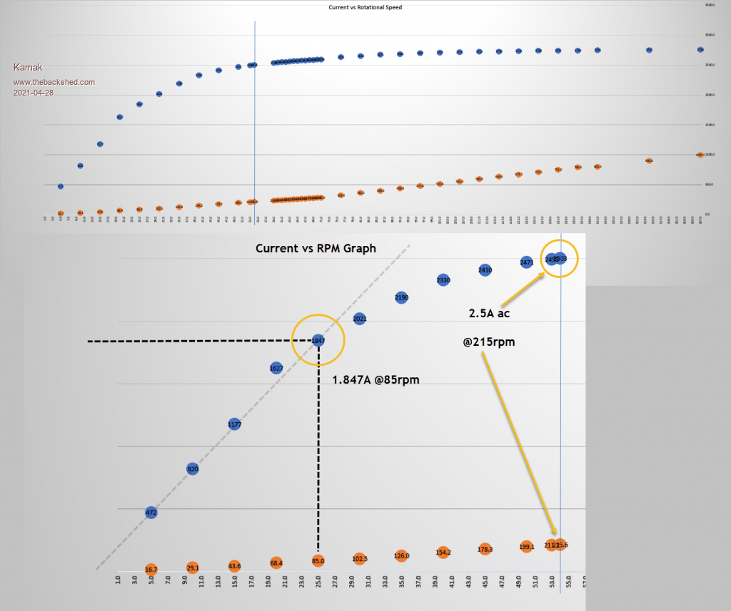 Conclusion: approx. 200RPM @ 2.5A, Maximum Return vs Cost-Benefit Point, really starts to taper off.