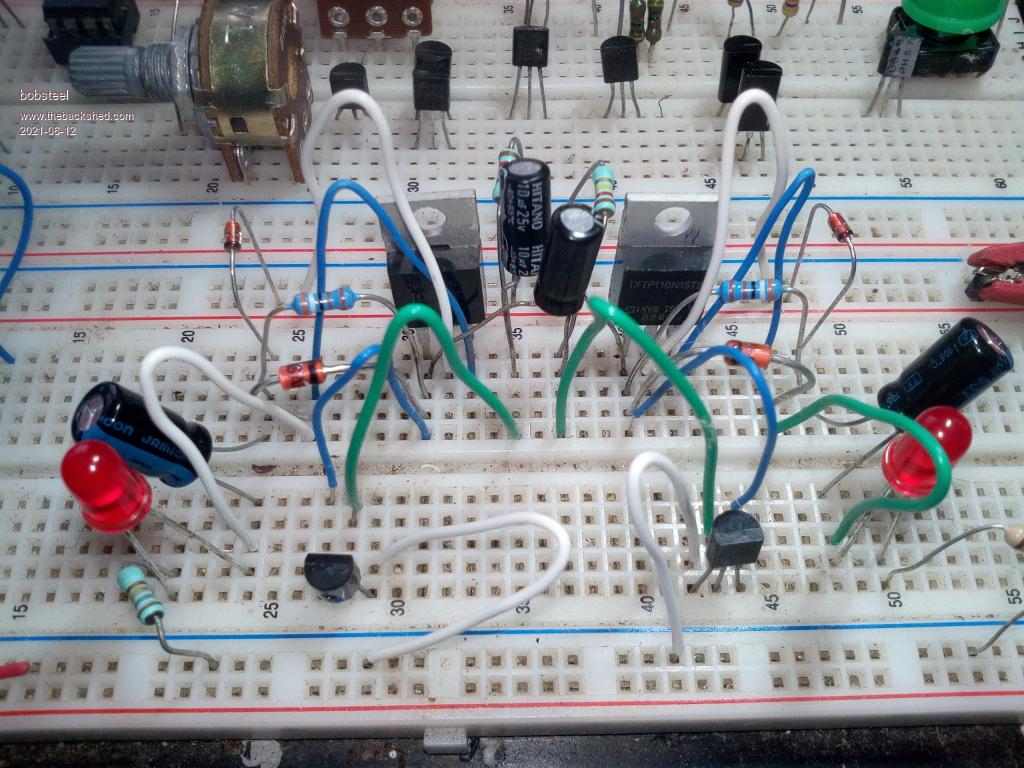 That was a good idea to send the picture. What are the small transistors are they the C2655 - it looks like you have wired it as if they were 2N3904's ? If they are C2655's swap the green and blue wires on both small transistors and try again. (ie blue to the centre green to outer). If it gets too hard, maybe Ill go build mine again and take a picture of it. The more than 1 function comment is described a bit better below: The current limit resistors (3K9 on your board) for the FET gates are also the collector resistors for the multivibrator bipolar transistors. The zeners allow the 2 gate capacitors to charge when the transistor connected to its gate is on (they are forward biased ~0.65V) and then hold the gate voltage to the value of the zener voltage when the transistor is off. The 2 x bipolar transistors act as a multivibrator pair and also alternately control the connected FET to be on and off. Edited 2021-06-12 20:05 by wiseguy If at first you dont succeed, I suggest you avoid sky diving.... Cheers Mike |