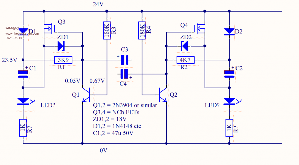 No joy there . ive tried it a few ways with a few transistors and a few Mosfets . It doen't work and I often get both led's on at the same time . I'm convinced its not going to work . If you build it again what might help is a few expected voltages on points of the circuit to check against Then if I'm not getting those I can track down my errors. I'm good at this . I built Forrest Mimms version on a breadboard and it worked fine but then I took the voltage over 20v and the mosfets died I think .I'll have to get something sorted soon. |