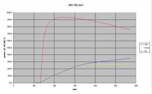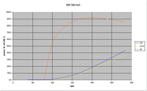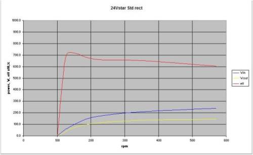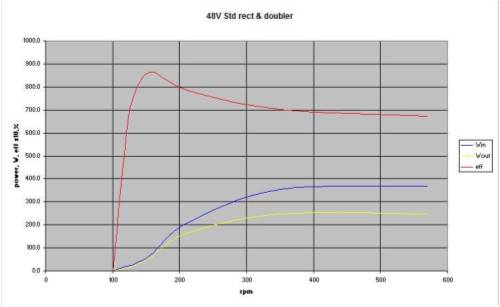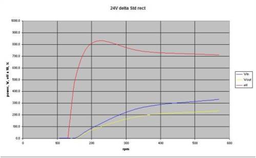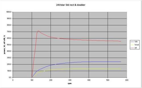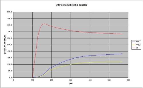 Hi readers, Phill has asked me to publish the first set of graphs. This will give some idea of typical 80SP rewire outputs into 24V & 48V systems with star and delta configurations with and without a capacitor doubler. and what can be achieved with a dual combination as Phill is planning to configure. This is the first of a series of testing. These are not laboratory std results, but all measurements were done on the same day, in the same sequence, with the same instruments and the capacitors used in the doubler were 50uF non polarised type of > 400VAC ratings. The graphs are annotated and should not require explanations. These graphs only test one value of capacitance so far, for a doubler combination only, in parallel with existing rectifiers. 24V Star ![]()