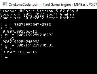 Tom: In that case the manual is wrong in both places. Of course, you shouldn't be assigning a number of more than 14 significant digits to a default float variable as it will then (accoring to the manual) be automatically stored as float. Only an integer can handle more than that without error. :) I'm quietly cursing only having a single monitor. It's a faff having to keep switching it over as it's multiple button presses. :( I'm not going to test with MMB4W as I've not got it, that's not the manual that I'm looking at and I've no idea if it works the same way. Edit: I just tested it and the manual appears to be either wrong or misleading. Simply entering a=1234567890 results in it becoming a float - or at least it does when you print it. Never assume anything. :) Edited 2022-08-04 05:14 by Mixtel90 Mick Zilog Inside! nascom.info for Nascom & Gemini Preliminary MMBasic docs & my PCB designs |