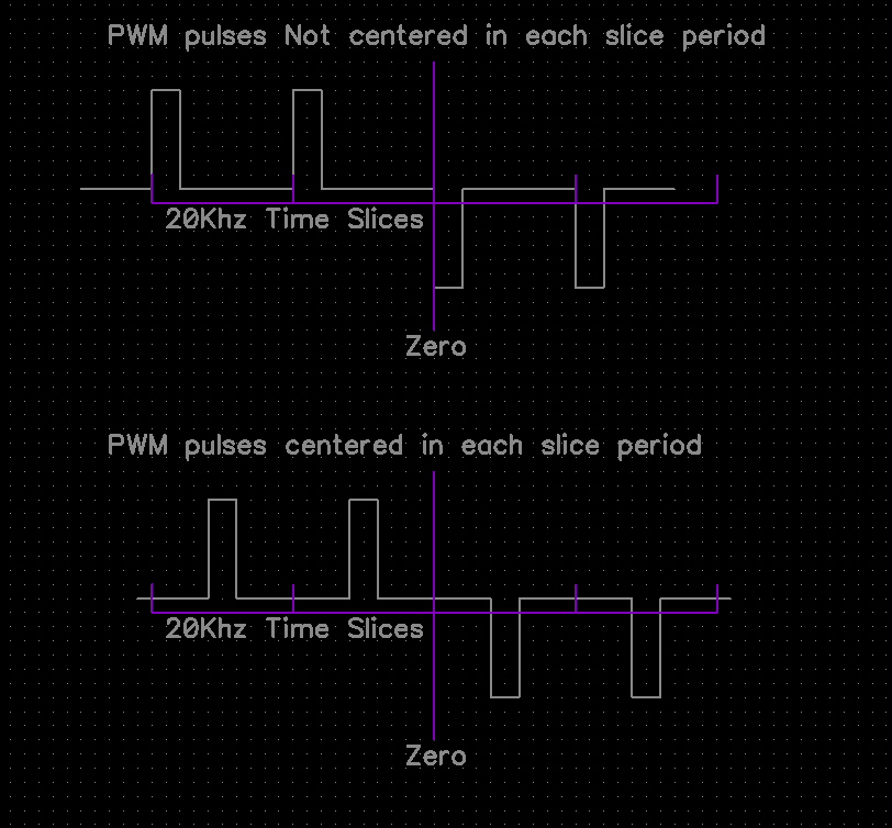 I was reading, cannot remember where, that if the PWM pulses are centered in each 20Khz time slice period, the modulation distortion is much reduced. See sketch below. I think its much easier to produce the PWM at the start of each period, eg after timer interrupt, as in the top sketch. If the CPU timers allow an offset and the bottom modulation achieved - 2nd sketch, then distortion products would be reduced and perhaps leading to more efficient operation. Cheers Mike |