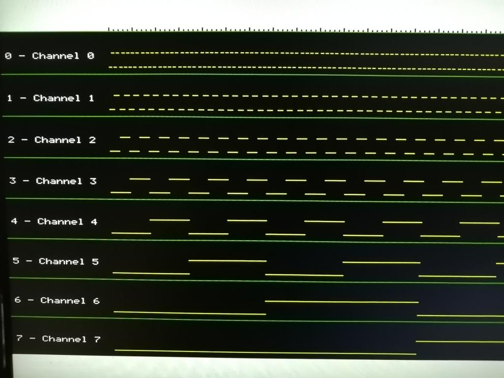for VGA it might look like this: ![]() At Top and Button you have Space for Information Text and settings Messages: You can also colorcode the first 16 Pixel of each Line with the CableColor as Tile BG-Color. MODE 1:Colour 0,RGB(WHITE):CLS :Font 7 For f%=0 To 7 Print @(0,88+48*f%) F%;" - Channel";f% TILE 0,5+f%*3,0,RGB(WHITE),6,2:TILE 6,5+f%*3,0,RGB(yellow),34,2 TILE 0,4+f%*3,0,RGB(midgreen),40,1 Line 0,64+f%*48,640,64+f%*48 Next scl%=5 For f%=96 To 640 Step 4 Line f%,62-2*(scl%=5),f%,63 Inc scl%:If scl%=6 Then scl%=1 Next 'testrun For F%=0 To 255 For n%=0 To 7 If f% And (2^n%) Then Plotline n%,1 Else Plotline n%,0 EndIf Next n% Next f% Sub plotline ch%,Vl% y%=ch%*48+88+16*(Vl%=0) x%=96+2.125*f% Line x%,y%,x%+2.125,y% End Sub cheers Mart!n Edited 2023-01-19 00:50 by Martin H. 'no comment |