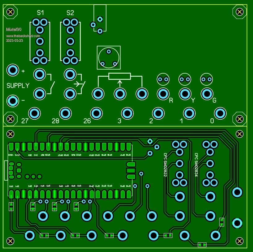 Right, this is only something to start with. I know it's incomplete, but I wanted to see what it would look like and how awkward the track would be likely to get. I've shown the front and the back of the board. it's shown as 50mm x 100mm but as you can see, space is restricted. This is about as cheap as it's possible to go, single PCB stood on short spacers. The pot is a square trimmer with a built-in knob. The switches are Multicomp from CPC and I left off the power switch, SD card and sensors. Putting stuff on top of a surface mounted PicoMite isn't good so it may have to be plug-in. That's awkward when you don't want to have the pins poking through. Mick Zilog Inside! nascom.info for Nascom & Gemini Preliminary MMBasic docs & my PCB designs |
