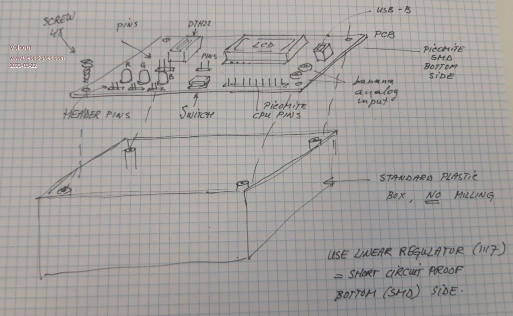 Had only few minutes, so this is my way of looking at it. All pins on top side (accessible) are ESD protected with series resistance and diodes. Power is from linear regulator (inherently short circuit protected) banana plugs give access to ADC via resitor network, so you can measure +- 10V LCD is fixed wired to picomite. No access. DTH22 is accessible. LED's and switches are accessible. The PCB acts as lid on the box. No milling, just 4 screws to put together. Linear regulator and picomite are SMD mounted on the bottom, so not accessible. Volhout Edited 2023-03-22 22:55 by Volhout PicomiteVGA PETSCII ROBOTS |