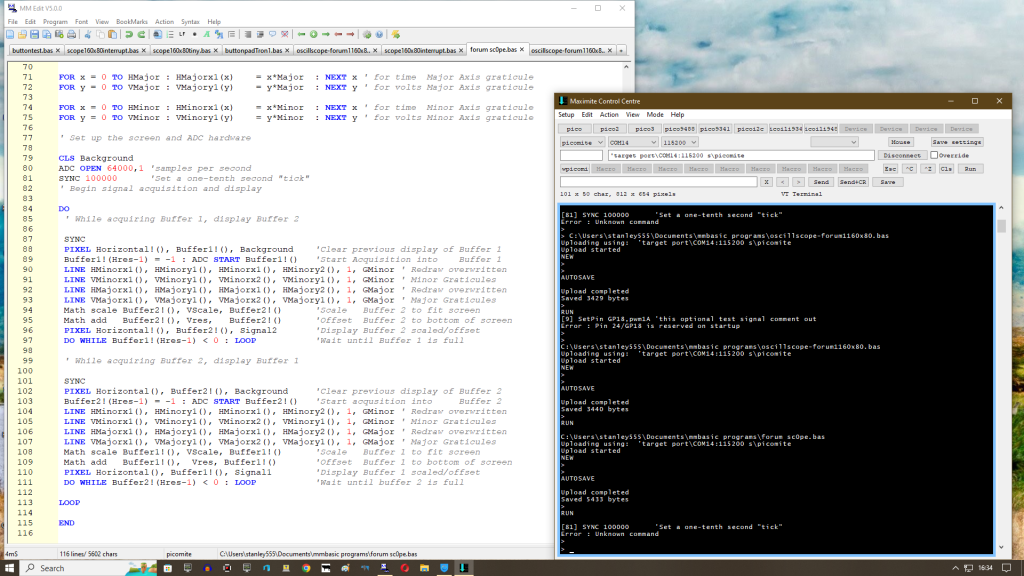 Could not get to work > C:\Users\stanley555\Documents\mmbasic programs\oscillscope-forum1160x80.bas Uploading using: 'target port\COM5:115200 s\picomite Upload started NEW > > AUTOSAVE Upload completed Saved 3269 bytes > RUN [19] Dim Buffer1!(Hres), Error : Syntax > > C:\Users\stanley555\Documents\mmbasic programs\oscillscope-forum1160x80.bas Uploading using: 'target port\COM5:115200 s\picomite Upload started NEW > > AUTOSAVE Upload completed Saved 3277 bytes > RUN [19] Dim Buffer1!(Hres), Error : Syntax > > C:\Users\stanley555\Documents\mmbasic programs\oscillscope-forum1160x80.bas Uploading using: 'target port\COM5:115200 s\picomite Upload started NEW > > AUTOSAVE Upload completed Saved 3276 bytes > RUN [34] Math Set 0, HGraty1() : Math Set Vres, HGraty2() ' Pre-set Arrays for Horizontal Graticules Error : Cannot find HGRATY1 > |