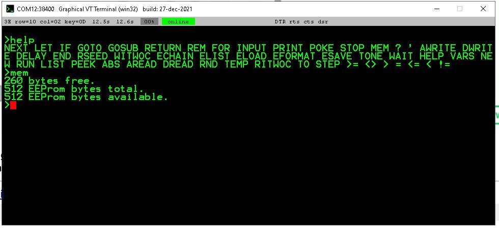 @Peter, I know you implemented I2C in the ATTINY. But the (very basic) way it is implemented, the basic code to talk to a I2C device consumes already half of the memory. Since most I2C devices support auto increment of registers, efficient basic code could make use of that. Not leaving much for any usefull coding. I know this proposal is not covering all I2C devices, but the few we could support may benefit from a format like this. WITWOC A,B,C,D,E (writes B,C,D,E to I2C device A, B could be a register pointer). RITWOC A,B,C,D (reads B,C,D from I2C device A). The start register pointer for read must be set in a separate IWRITE. Regards, Volhout Edited 2023-08-01 17:45 by Volhout PicomiteVGA PETSCII ROBOTS |