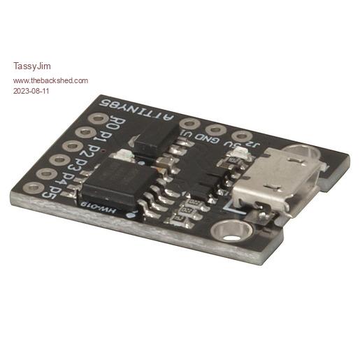 I have been playing 10 'kw\attiny 20 N = 16384 30 PRINT n* 2 40 n = n * 2 50 PRINT n 60 PRINT n-1 RUN --.)*( --.)*( 32767 OK > Trying to print 32768 gets interesting. As well as some loose chips, I purchased these boards ![]() I didn't notice that there were only the 6 IO pins on the header. The 5V and GND are on the side making strip-board use not as friendly as I had hoped. The pins on the header are in PB order, not physical pin number which is not a problem, just untidy. The good news is, it has 78M05 regulator on board so powering from 12V is easy. The USB is not usable as data but handy for powering from a 5V plugpack. I think/hope I have stomped on all the bugs when using it with MMEdit. Jim VK7JH MMedit |