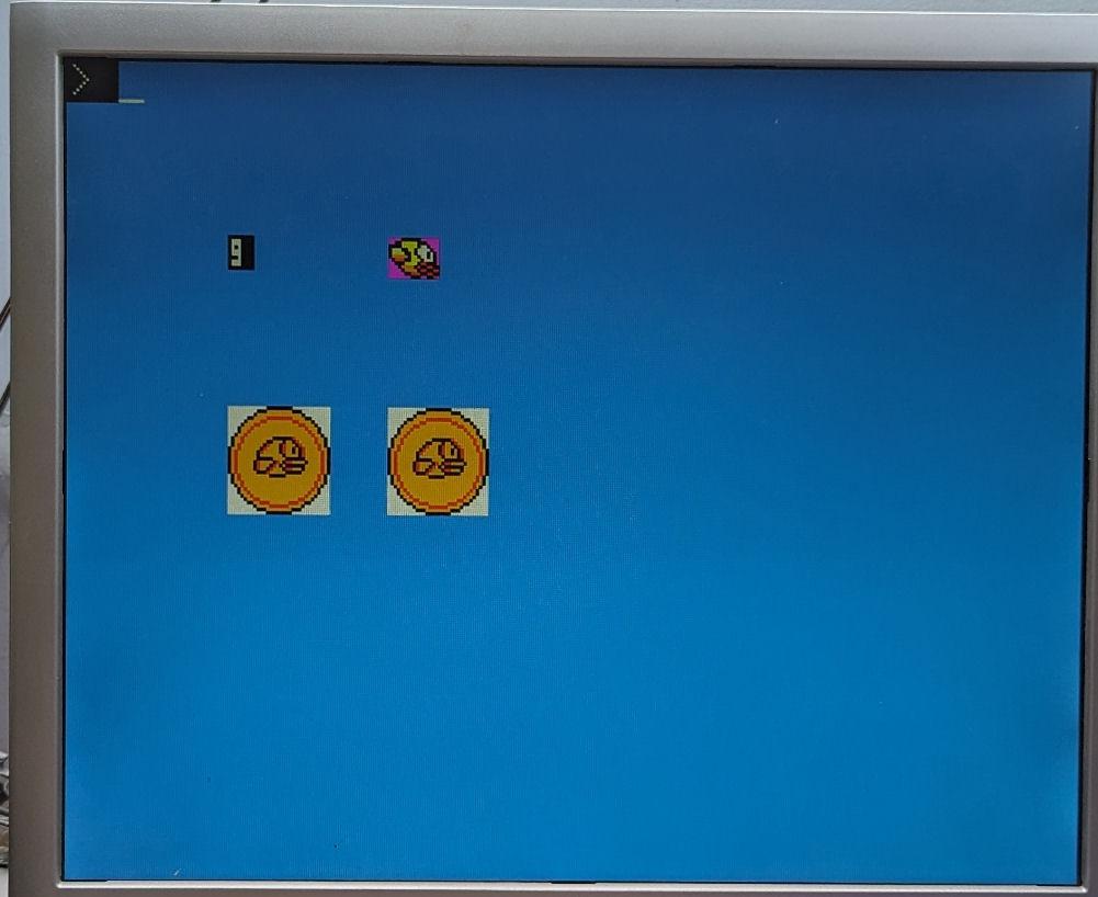 The Flappy game (and as matter also the PETSCII game) is developped in PicoMite VGA. It uses RGB 1:2:1. This is Flappy 10. The graphical elements are converted from BMP to sprites. And these (sometimes compressed) sprites are used in the VGA version to build up the graphical elements on screen.