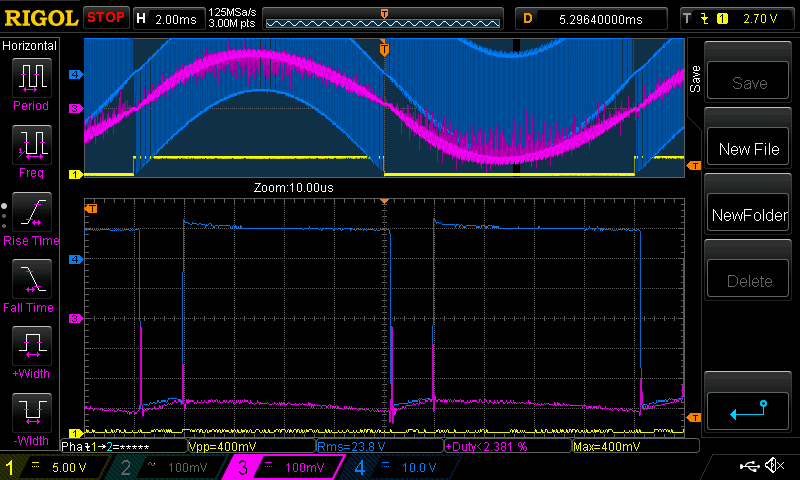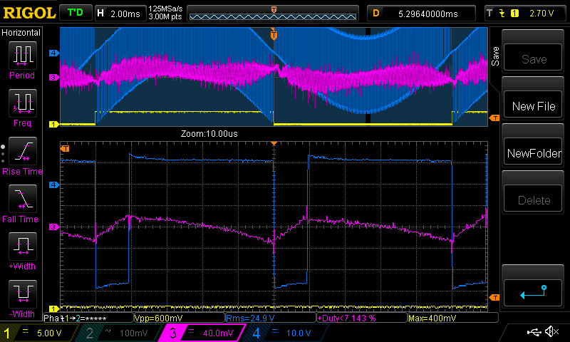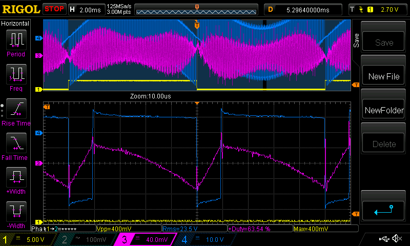 Nice pics Poida - thank you. Any chance of an efficiency measurement for both chokes at 200W. My money is on the smaller 65uH choke as it seems to be doing more under load, storing and releasing energy, hope its not the 188uH one. The purple spikes in my opinion may be related to excess dead time - dont get me wrong too much is boring and safe, too little though can get quite exciting. The expanded part of the waveform appears to be very near the zero crossing point. If time permits could you please indulge me and also maybe look at the peak of the sine, And even at the 50% points it may be a little more revealing. I would expect the textbook sawtooth you see in pic 3 upon more heavy loading should increase its p-p appearance, alas I am working for the next 2.5 days and will have no time to set up and see these answers. Edited 2024-01-31 08:11 by wiseguy If at first you dont succeed, I suggest you avoid sky diving.... Cheers Mike |
