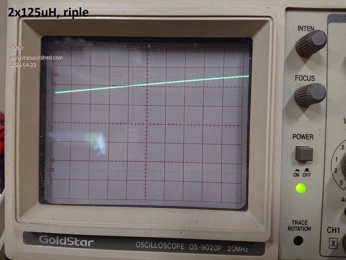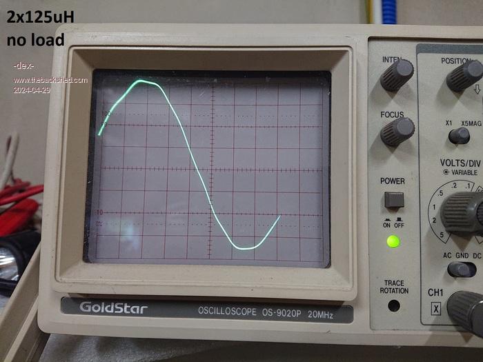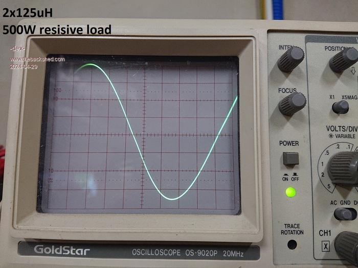 The inductance of the first chokes (2x 10uH) turned out to be too low. I went the other way and wanted to check what would happen when the inductance will be much higher than required. This 10kg choke is originally rated at 250uH/200A. So I disconnected the two series windings and obtained two separate coils of 125uH each. ![]() ![]() Connection diagram as in the diagram below. No-load waveforms has obvious distortions. The ripples are not noticeable. A resistive load reduces the wave shape to a perfect sinusoid, while all other types of loads cause very strong wave deformations. ![]() ![]() ![]() ![]() I also connected other loads, and the wave deformations are very deep. |