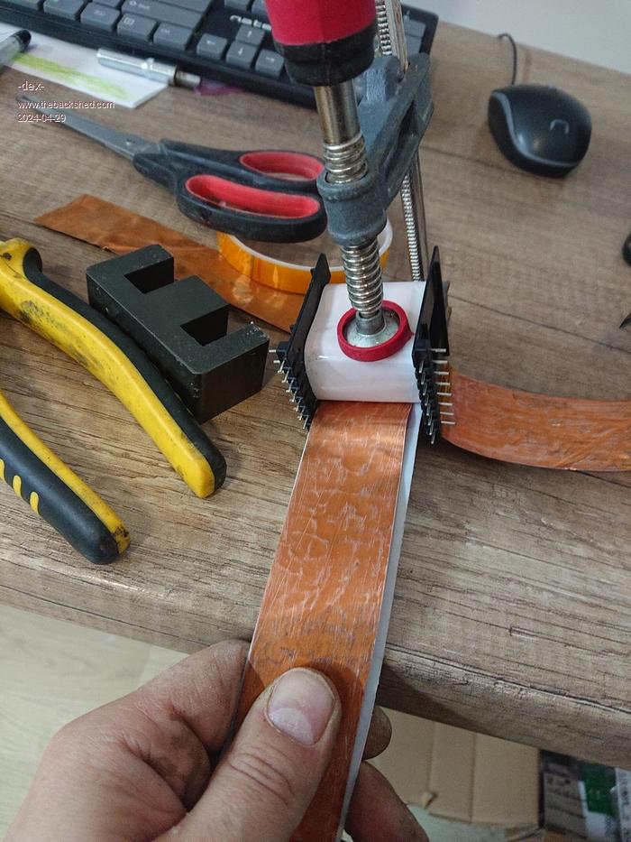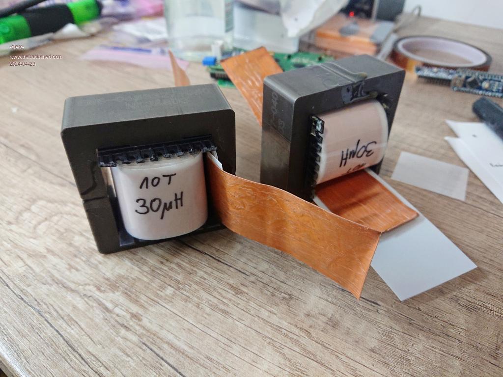 I go back to the EMS cores and re-wind them as shown in the photo. This white tape is a 0.19mm thick Mylar film cut from a large sheet. Unfortunately, to accommodate the required number of turns, I placed not two, but one layer of copper tape. With my maximum loads up to 150A, which usually do not last longer than 10-15 minutes, this means an increase in the temperature of the copper tape by about 20 degrees. No I have 2 x30uH and the saturation current is somewhere around 160A. So this chokes will continue to be tested and closely watched. The waveforms looks very good. Changes in the waveforms under load are not as drastic as in the case of 2x125uH, although they are also visible. So far I've only caught waves at no load. Even though the choke is glued and fastened with clamps, it makes a squealing sound during operation, which gets louder and louder when I load the inverter. ![]() ![]() ![]() Edited 2024-04-29 20:00 by -dex- |