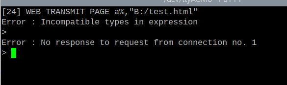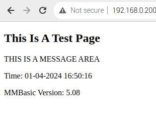 Hi All; I posted this problem during the 5.09Beta posts for the WebMite and it was suggested that I re download the firmware again. I have been doing this for every update till now RC3 and still have the same problem. This worked under 5.08; ![]() These are the current options under 5.09RC3; ![]() The program error message; ![]() The program code; Dim buff%(4096/8) Dim string mystring,mytime,currentversion currentversion = Str$(MM.Info(version)) mystring = "THIS IS A MESSAGE AREA" WEB TCP INTERRUPT WebInterrupt Do '<do some processing here>' mytime = DateTime$(now) Loop Sub WebInterrupt Local a%, p%, t%, s$ For a% = 1 To MM.Info(MAX CONNECTIONS) WEB TCP READ a%, buff%() p% = LInStr(buff%(),"GET") t% = LInStr(buff%(),"HTTP") If (p% <> 0) And (t% > p%) Then WEB TRANSMIT PAGE a%,"B:/test.html" EndIf Next a% End Sub It is the same code as in the 5.08 manual with the addition of variables. The HTML; <!DOCTYPE html> <html> <body> <h2>This Is A Test Page</h2> <p>{mystring}</p> <p>Time: {mytime}</p> <p>MMBasic Version: {currentversion}</p> </body> </html> I must have looked at this a million times and don't see the problem. Any ideas? Hans ... |