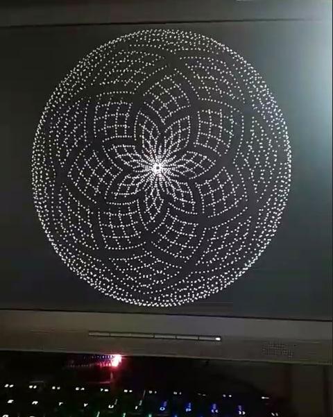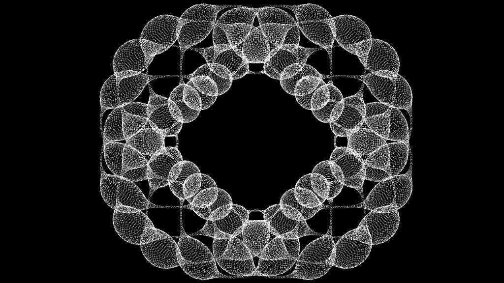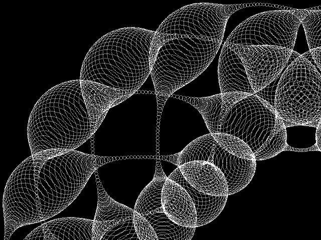 ![]() T=3000 For L=1 To T A=10*Pi*L/T B=16*Pi*L/T X=600*Cos(A)*(1-.5*Cos(B)^2) Y=600*Sin(A)*(1-.5*Cos(B)^2) R=600*(.005+.1*(Sin((52*Pi*L)/T))^4) For K=0 To 2*Pi Step Pi/R/1.5 Pixel 600+X+Cos(K)*R,600+Y+Sin(K)*R Next K Next L |
