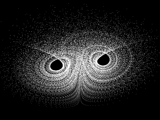 Lorenz Attractor Lorenz_System ![]() MODE 1 x=3.051522: y=1.582542: z=15.62388 dt=0.04: a=5: b=15: c=1 Do x1=x+a*(-x+y)*dt y1=y+(b*x-y-z*x)*dt z1=z+(-c*z+x*y)*dt x=x1: y=y1: z=z1 px=Int(29*(y-x*.2)+320) py=Int(-15*(z+x*.2)+460) Pixel px,py Loop |
