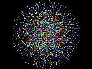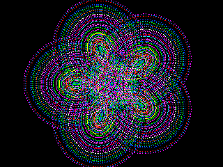 Star ![]() ![]() MODE 2 RX=MM.HRes:RY=MM.VRes:CX=RX\2:CY=RY\2 RR1=150:RR2=-50:RR3=30:K=0.45:Q=0.1 For R1=RR1 To 187 Step 5 For R2=RR2 To 240 Step 5 Q=Rnd*2 For R3=RR3 To 240 Step 5 COL=Int(Rnd*&hFFFFFF) For T=0 To 600 Step Q X=Int((R1+R2)*Cos(R2*T/R1)-R3*Cos((R1+R2)/R1*T)) Y=Int((R1+R2)*Sin(R2*T/R1)-R3*Sin((R1+R2)/R1*T)) Pixel X*K+CX, Y*K+CY, COL Next T Next R3 Pause 1000: CLS Next R2 Next R1 End |