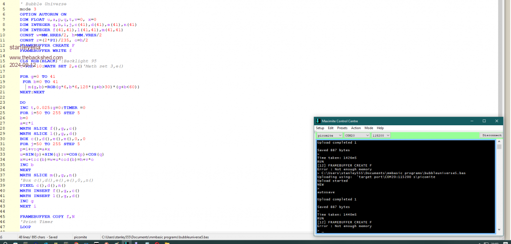 ' Bubble Universe mode 3 option autorun on Dim Float u,a,p,q,t,v=0, x=0 Dim Integer g,b,i,j,c(41),d(41),e(41),n(41) Dim Integer f(41,41),l(41,41),m(41,41) Const w=MM.HRes/2, h=MM.VRes/2 Const r=(2*Pi)/235, o=h/2 FRAMEBUFFER CREATE F FRAMEBUFFER WRITE f CLS RGB(black)':Backlight 95 t=Rnd*10:math set 2,e()'Math set 3,e() For g=0 to 41 for b=0 to 41 m(g,b)=rgb(g*6,b*6,128*(g+b>30)*(g+b<60)) Next:Next Do Inc t,0.025:g=0:Timer =0 For i=50 To 255 Step 5 b=0 a=r*i Math Slice f(),g,,c() Math Slice l(),g,,d() Box c(),d(),e(),e(),0,,0 For j=50 To 255 Step 5 p=i+v:q=a+x u=Sin(p)+Sin(q):v=Cos(p)+Cos(q) x=u+t:c(b)=w+u*o:d(b)=h+v*o Inc b Next Math Slice m(),g,,n() 'Box c(),d(),e(),e(),0,,n() pixel c(),d(),n() Math Insert f(),g,,c() Math Insert l(),g,,d() Inc g Next i FRAMEBUFFER COPY f,N 'Print Timer Loop RUN [12] FRAMEBUFFER CREATE F Error : Not enough memory > more pico2 stuff that worked 2040. stan? |