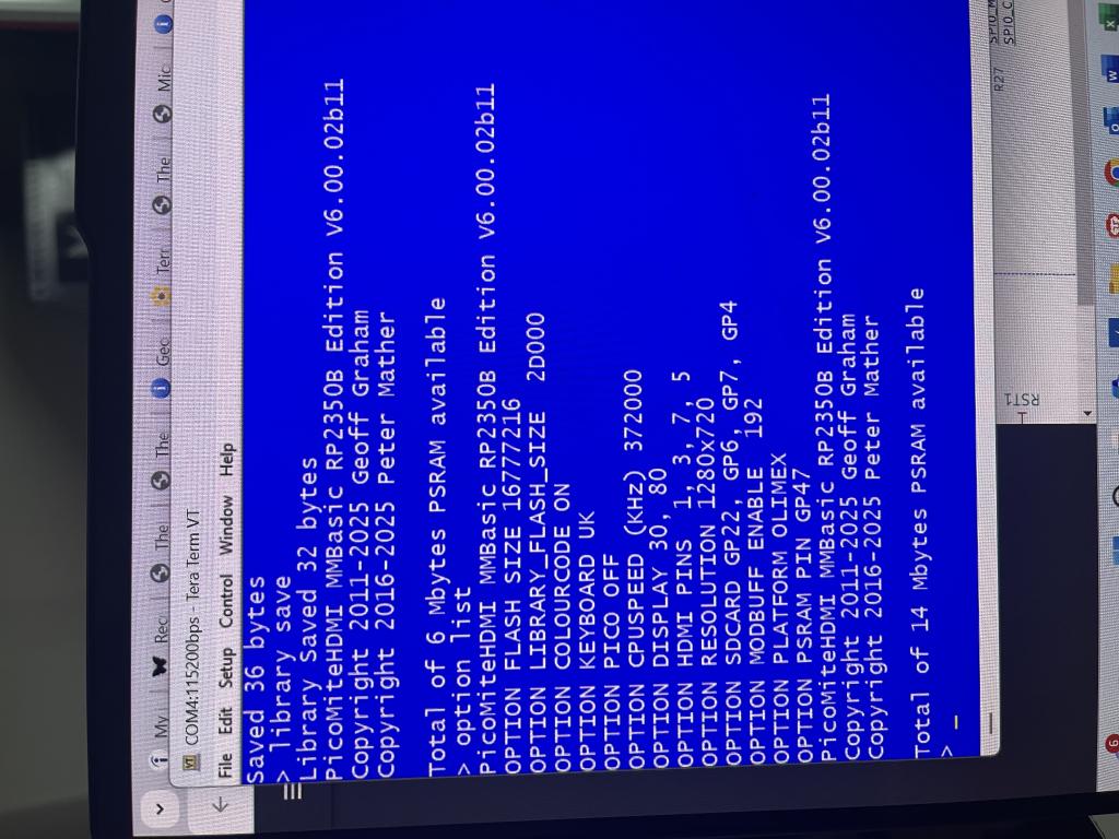 @Peter, Posting on this thread as opposed to the ‘Beta’ one since I am currently using the OLIMEX RP-2040-Pico-PC carrier board (and a Pimoroni Plus 2 with b11 ; HDMI firmware). The Plus 2 gives me a RP2350B so that I can test PS Ram stuff. One observation - the number of ‘Mbytes PSRAM available’ varies between 6, 8 and 14 (with no changes being made; just re-booting). See photo below. Is this as you’d expect? FYI - I am trying to get a Pimoroni PGA breakout working so soldered up a USB to it and loaded HDMI b11. If resolution is 640 (and hence the default when firmware first loaded) then all seems ok (noting this is @ cpuspeed 315000). However, changing to 1024 or 1280 causes very random behaviour - sometimes resets things to default. Due to instability (and you ‘Eureka’ thread, I reverted to the Pimoroni Pico Plus 2 (as per the message above) and all seems stable. HAVE YOU (or anyone out there) tried the Pimoroni PGA module with HDMI at the higher resolutions? Ultimately I am after the extra pins….. |